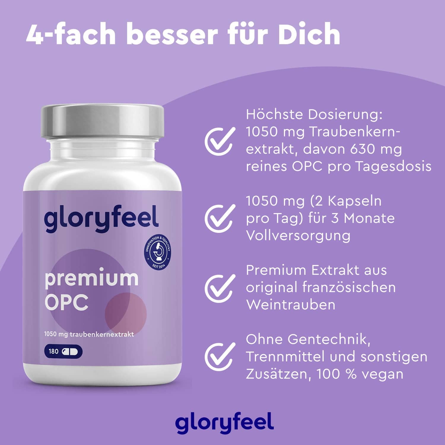 OPC gehören zur Gruppe der Polyphenolen, wertvolle sekundäre Pflanzenstoffe. Unsere Kapseln versorgen Dich täglich mit 1050 mg reinem Traubenkernextrakt, davon 630 mg OPC.