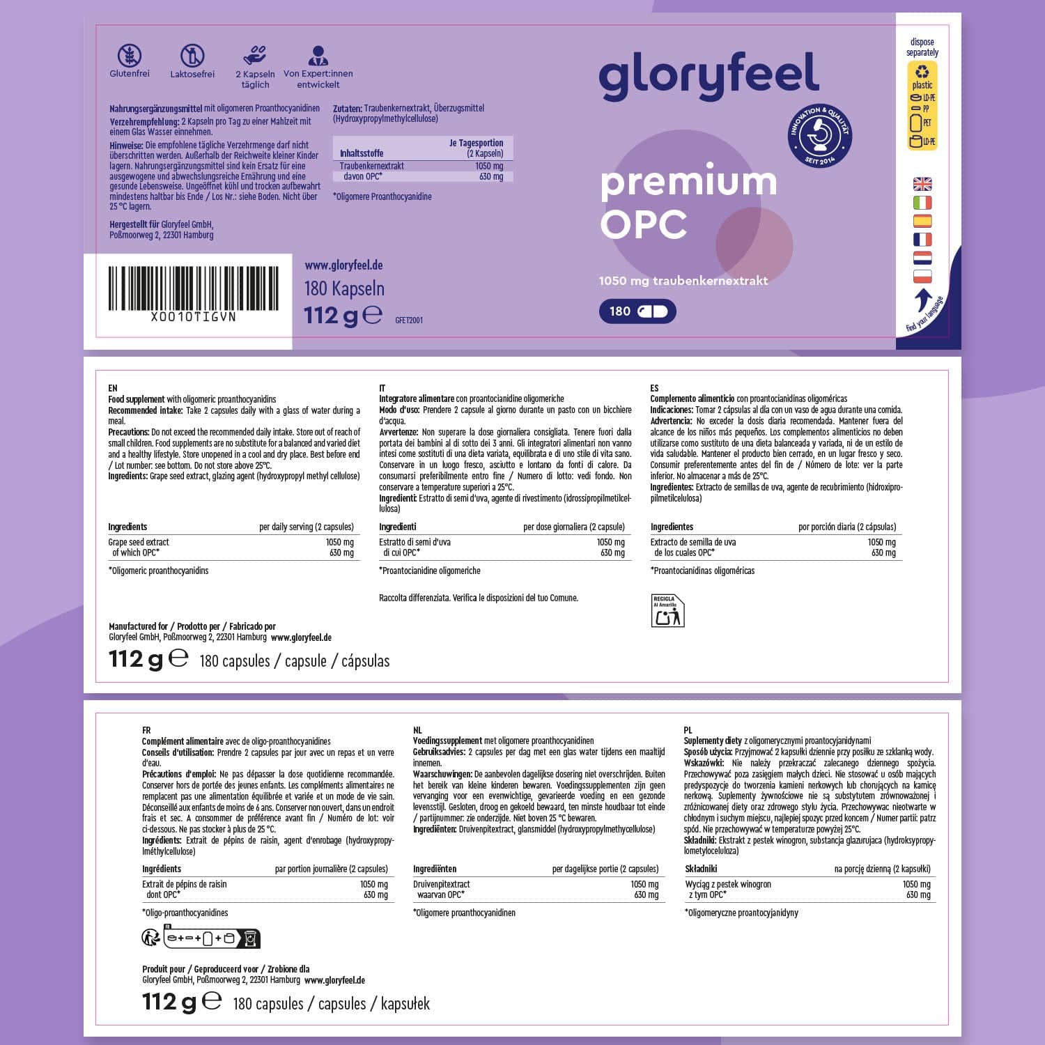 Das Premium OPC Extrakt wandert pur ohne Zusatzstoffe direkt in die pflanzliche Kapselhülle (HPMC). Dabei positionieren wir uns klar gegen gentechnisch veränderte Inhaltsstoffe im gesamten Produktionsprozess – von der Ernte der Trauben bis zur fertigen OPC Kapsel.